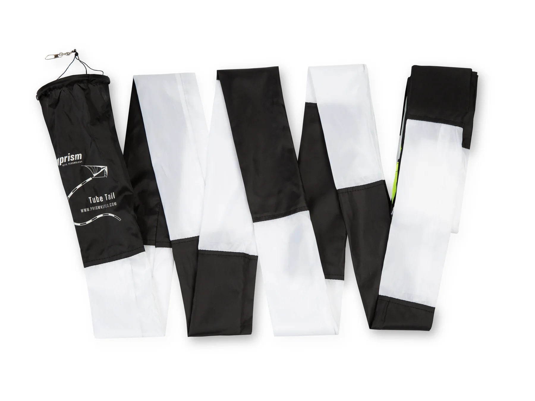 This 75 foot tube tail from Prism features a black and white striped tube with neon yellow tip. Attach this tail to a single line kite, for added stability, or to a dual line kite to create a mesmerizing show in the sky. Each tube tail comes with: tail, drawstring pouch, and swivel attachment.