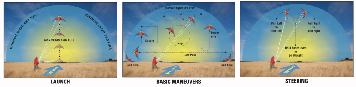 - Launching: Get the kite in an upright position. Gently tug on both lines so the nose is pointed towards the sky. Once you do this you give a sharp tug back and downward on both lines and take a few steps backward until the kite rises into the sky.