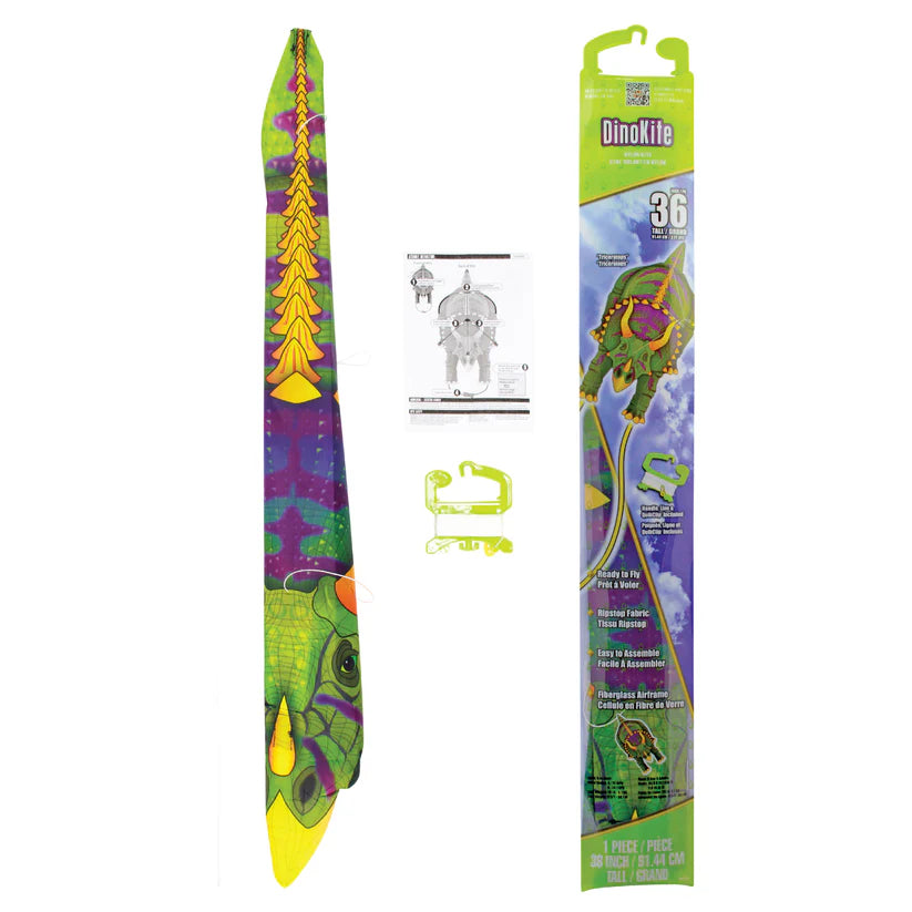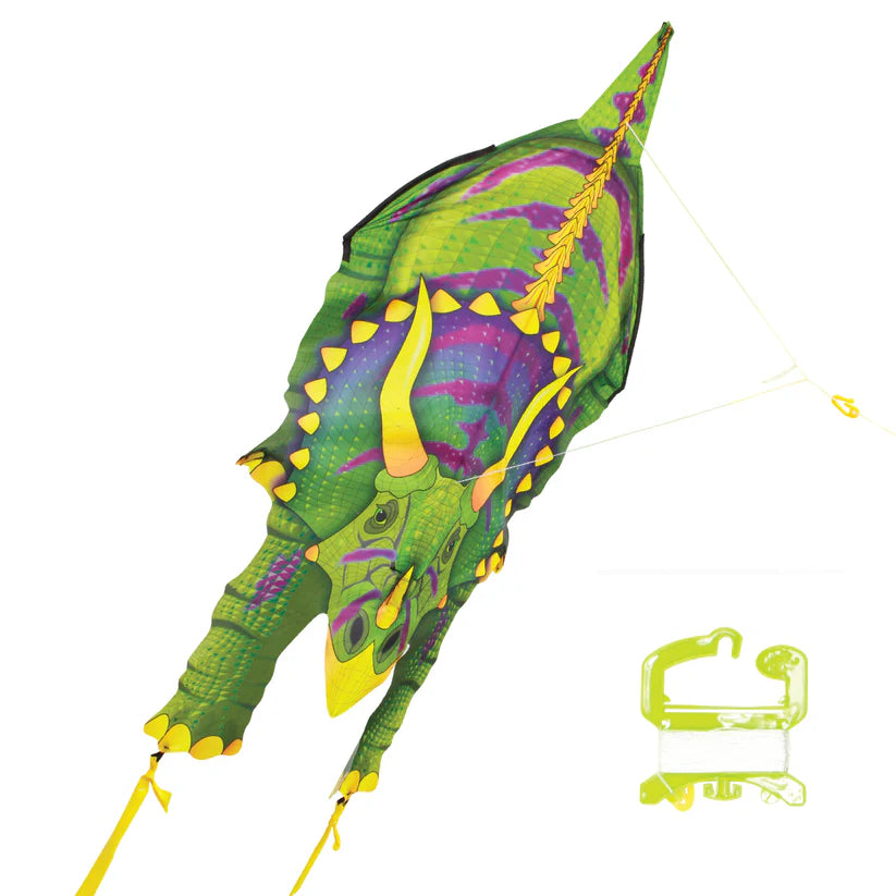 The X Kites DinoKite Triceratops Nylon Dinosaur Kites come with Triceratops DinoKite Nylon Dinosaur Kite Sail, Fiberglass Airframe, SkyTails, Kite Handle, and 125ft of 20lb Kite Line w/ QuikClip.