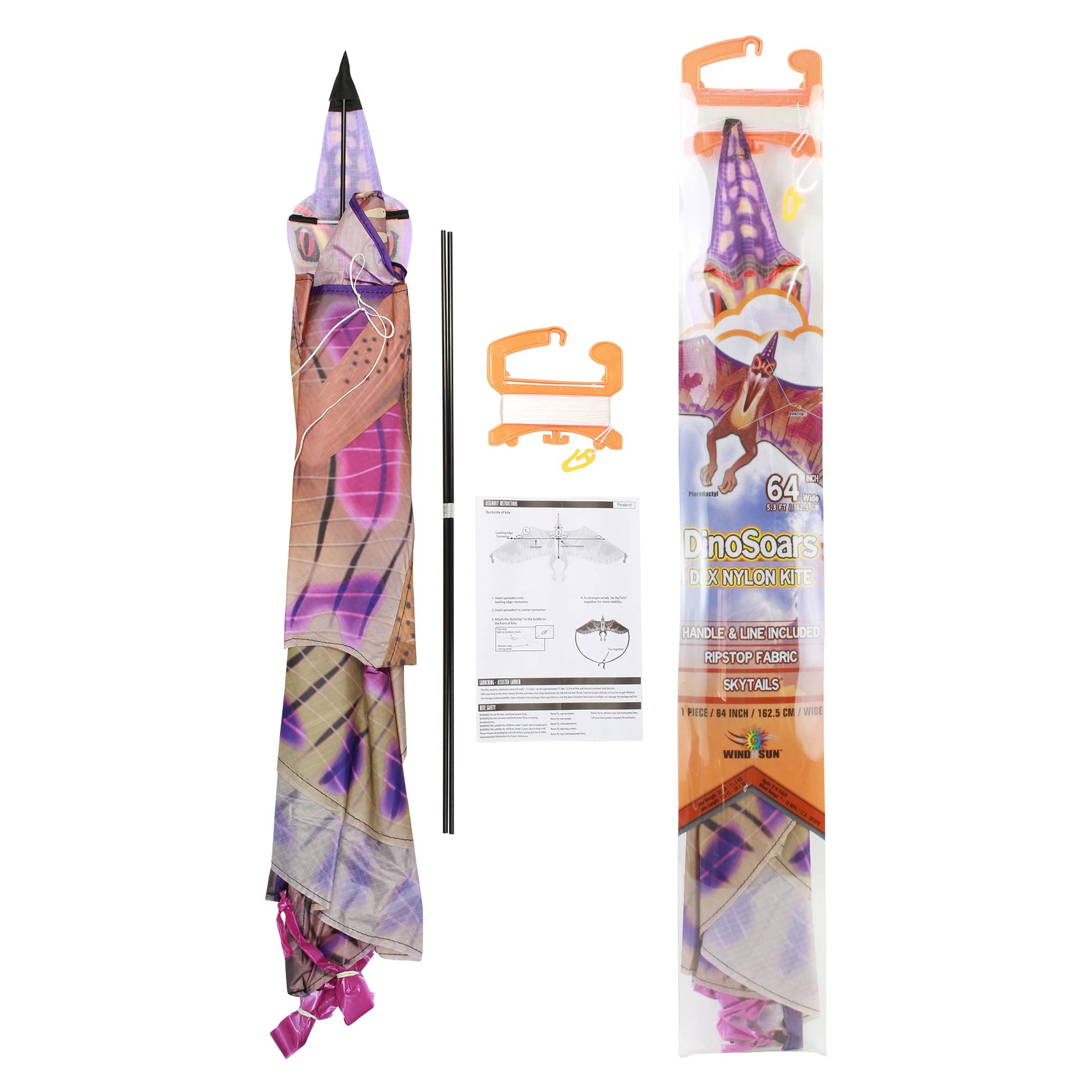 • Pterodactyl Kite: Easy to assemble and fun to fly; Perfect for the beach, park or picnic; SkyTails, handle, and line included; Age rating 8 to adult; Wind rating 5-15 MPH