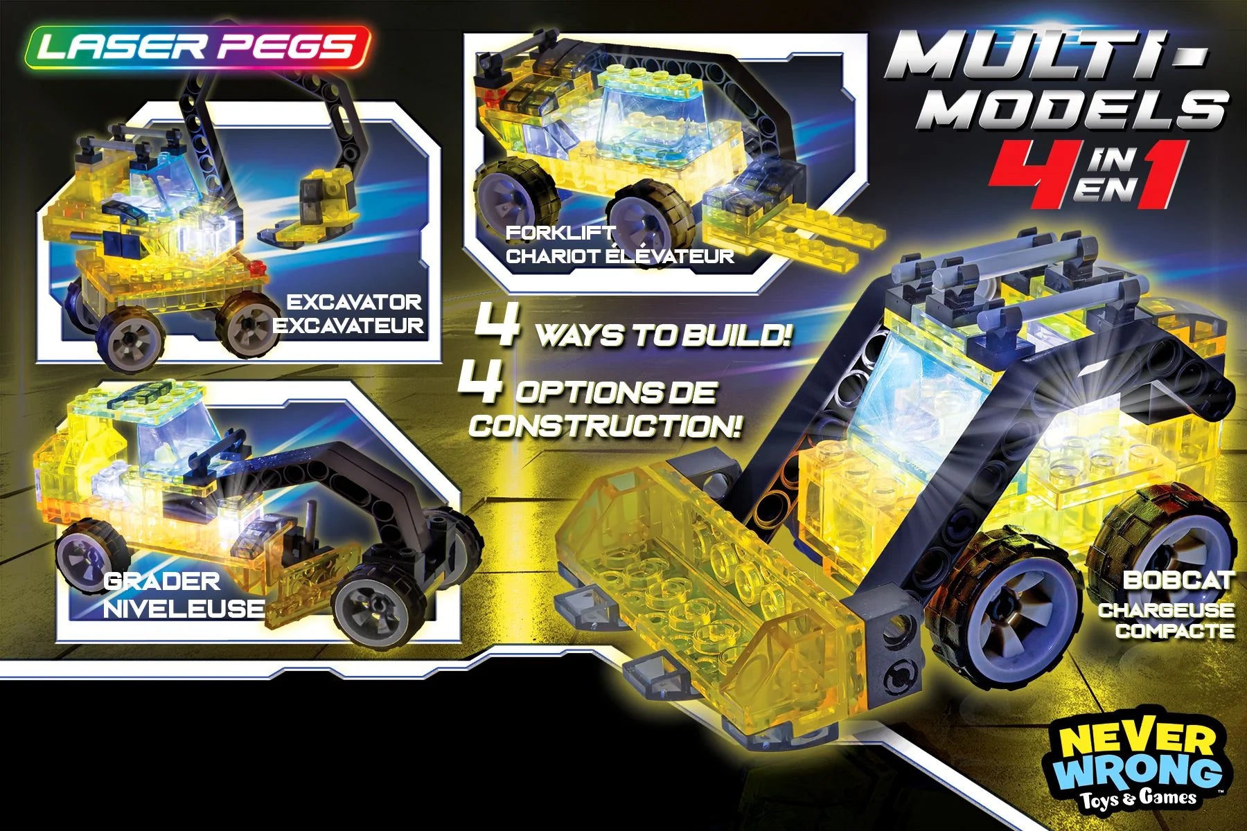 • 4 building options in 1. This set develops building skills as kids make a MultiModel 4-in-1 Bobcat, Excavator, Grader, and Forklift. The models can be played solo or combined with other Laser Pegs sets.