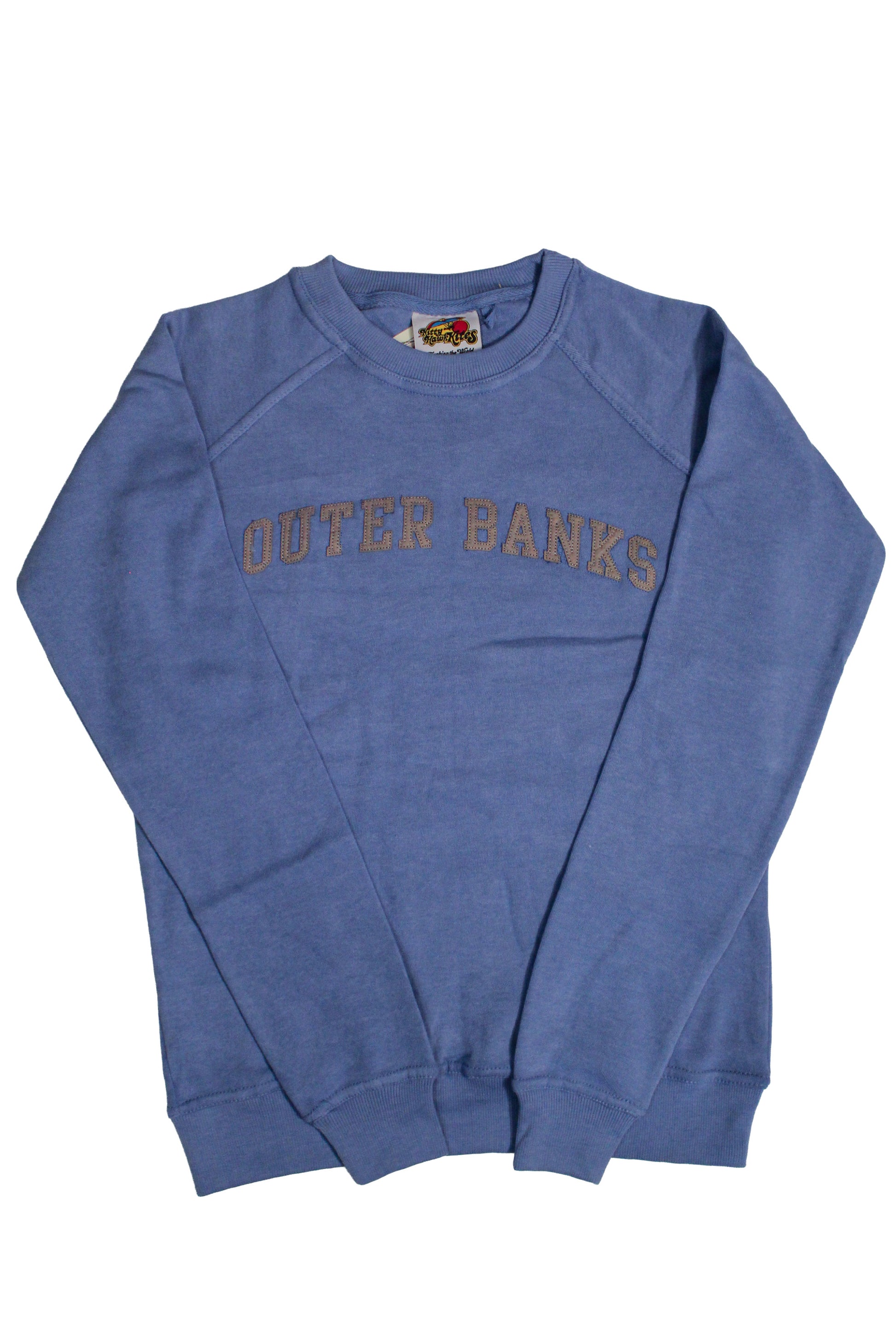 Blue (Washed Denim) Crewneck Sweatshirt with an Outer Banks applique arched across the chest in grey.