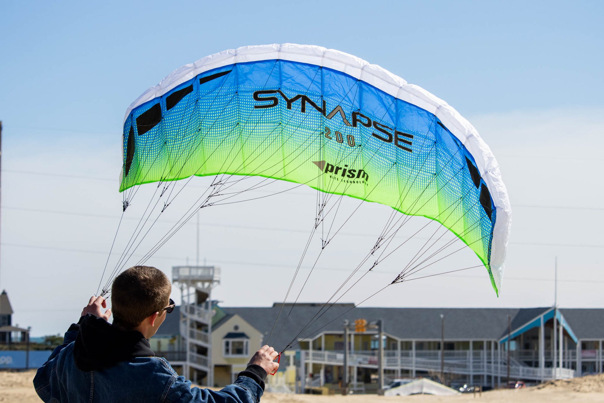 With any kite, the bigger the wing the more you’ll feel the power of the wind. The 200 is the biggest of the three Synapses and when the wind comes up it’s got enough pull to give you a workout! When the breeze is light that extra sail area will keep it aloft when smaller kites are struggling.