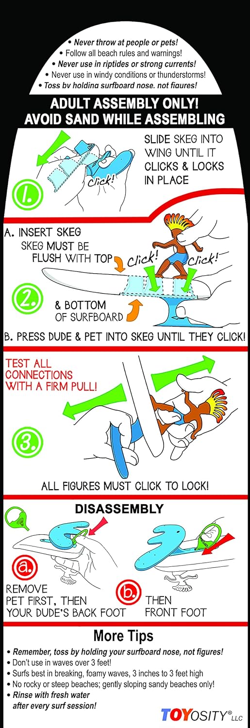 Introducing the premiere self-righting, self-surfing, surfer dude toy. The perfect beach toy for kids and adults. Don't just sit in the sand. Toss your dudes into the surf and they'll automatically turn around and catch a wave! No batteries required! The secret is in our patented self-righting hydrodynamic manta wing and unsinkable board! Sweet!