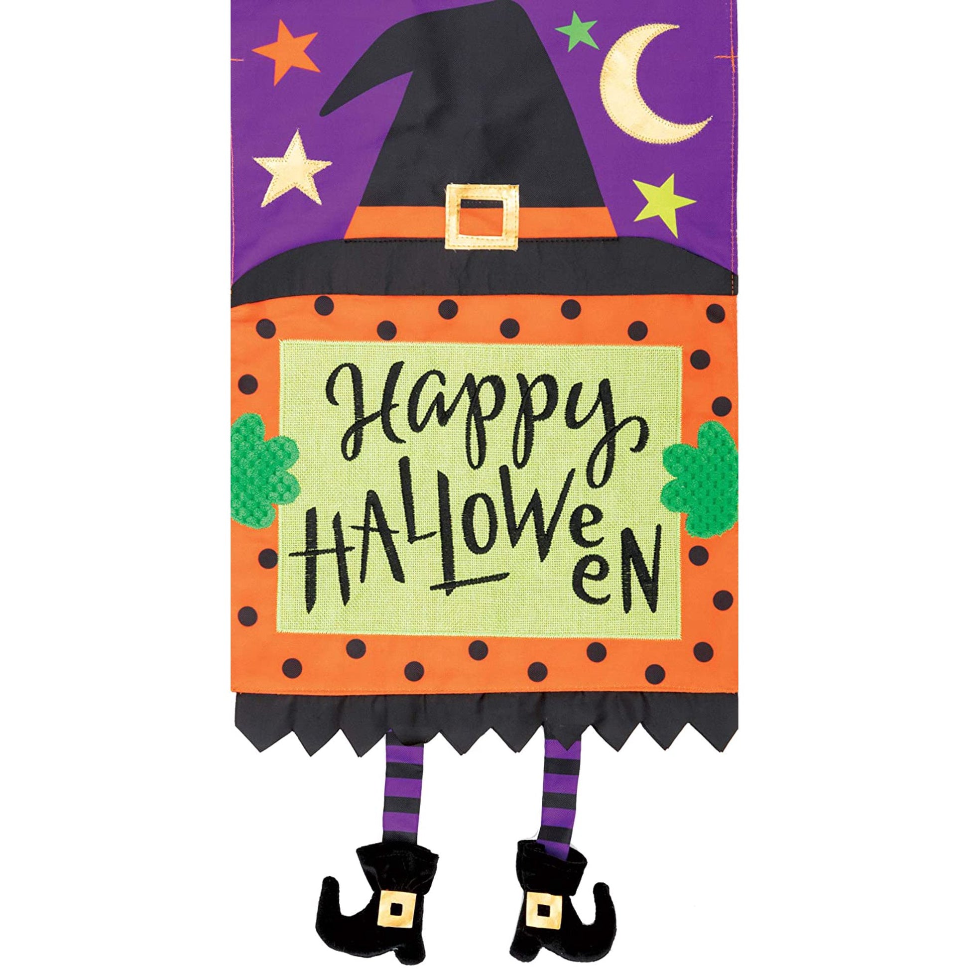 - This beautiful flag features applique and embroidery to create a unique effect and the dangling witch legs add additional charm
